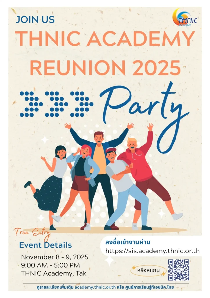 ศูนย์การเรียนรู้มูลนิธิศูนย์สารสนเทศเครือข่ายไทย (THNIC Academy) จัดกิจกรรม THNIC Academy Reunion 2025 ระหว่างวันที่ 8 – 9 พฤศจิกายน 2568 ณ THNIC Academy จังหวัดตาก เพื่อสร้างความสัมพันธ์อันดีระหว่างนักเรียน นักศึกษาที่ผ่านการอบรมหลักสูตรต่าง ๆ และกิจกรรมของ THNIC Academy ตลอดจนเปิดโอกาสให้ผู้สูงอายุและครูอาจารย์ในจังหวัดตากเข้าร่วมกิจกรรมอันอบอุ่น